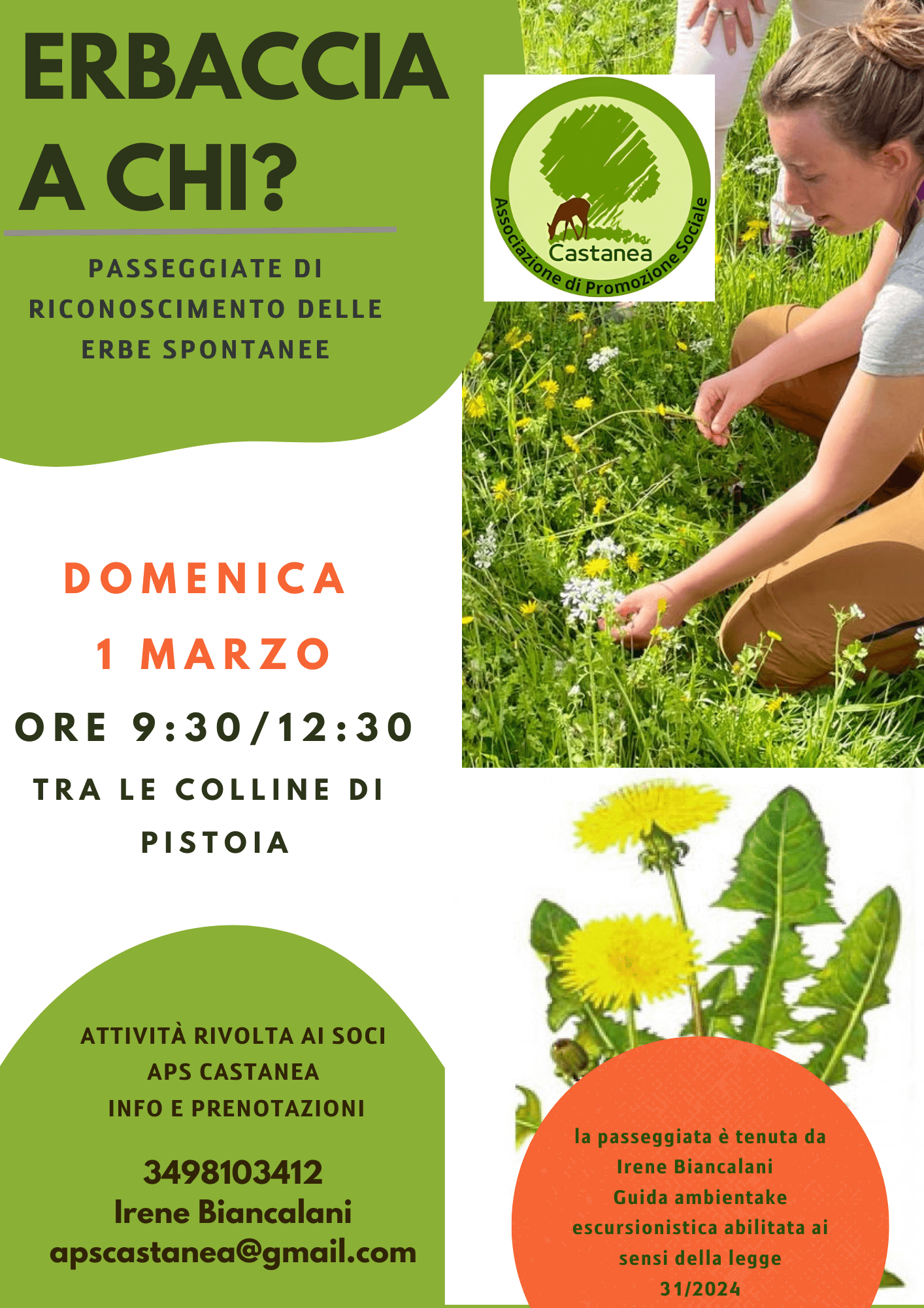 Passeggiata mattutina, semplice e adatta a tutti, dedicata al riconoscimento delle erbe spontanee tra le colline di Pistoia, con Irene Biancalani di Castanea APS, guida ambientale escursionistica ed esperta nel riconoscimento delle piante spontanee.