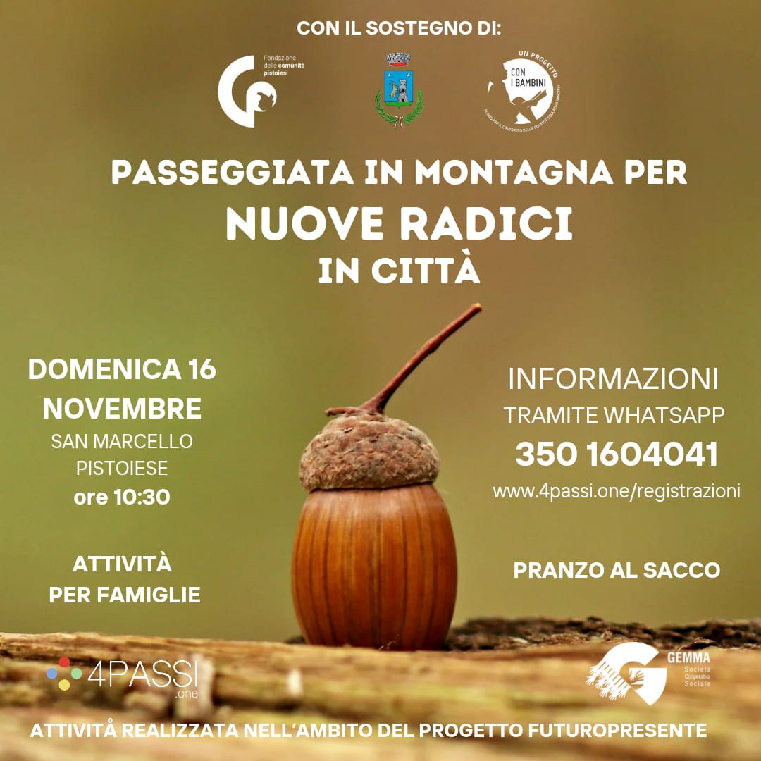 Insieme alle guide di 4Passi.one trascorrerete una giornata all’aria aperta a Piteglio, sulla Montagna Pistoiese, con una facile passeggiata nel bosco alla ricerca di ghiande, castagne, semi e piccoli germogli: piccoli tesori della natura che, con un po’ di cura, potranno un giorno diventare alberi da piantare nelle nostre città.