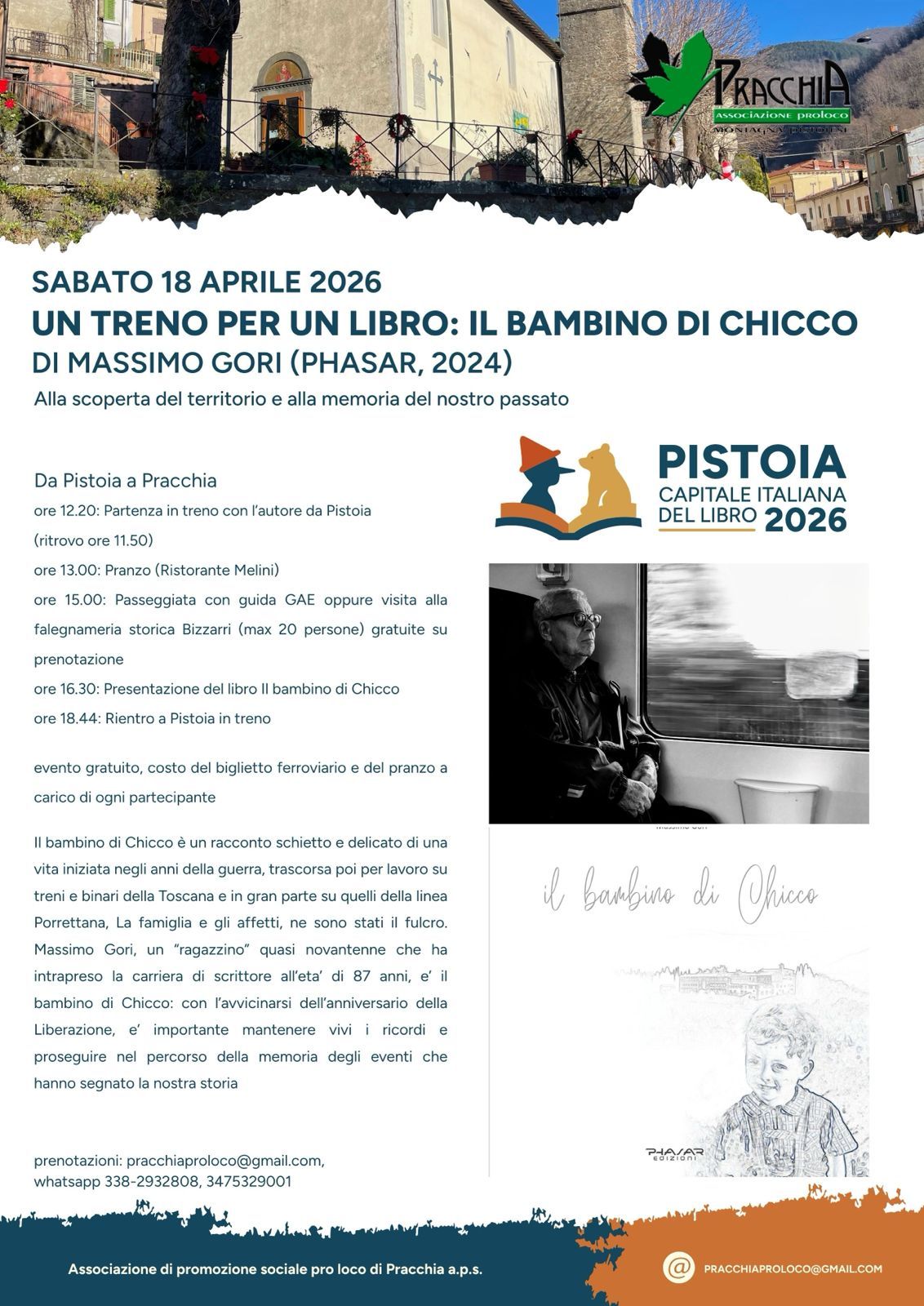 Sabato 18 aprile 2026, la Pro Loco di Pracchia propone un’iniziativa davvero speciale dal titolo Un treno per un libro, un’esperienza che fonde territorio, memoria e letteratura, alla scoperta del libro Il bambino di Chicco di Massimo Gori.