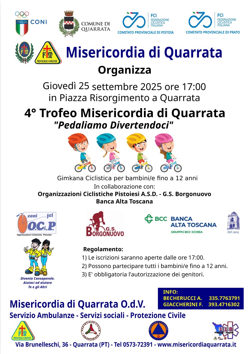 Giovedì 25 settembre 2025, alle ore 17, in Piazza Risorgimento, la Misericordia di Quarrata organizza 4° Trofeo Misericordia di Quarrata – Pedaliamo divertendoci, una ginkana ciclistica per bambini.