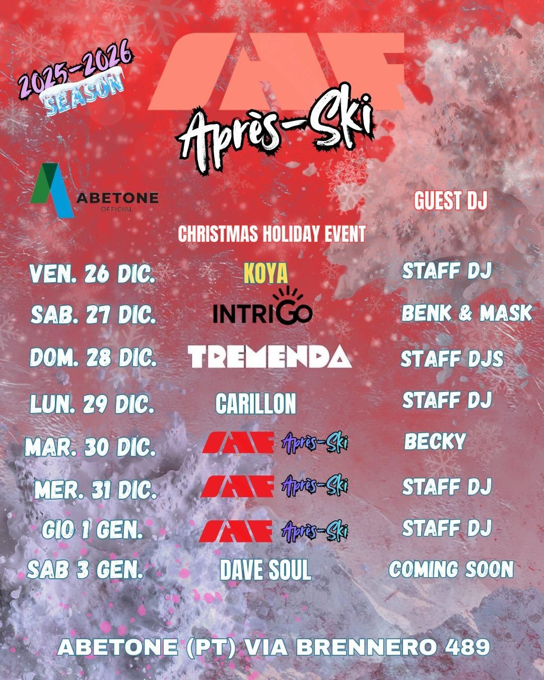 Durante le vacanze di Natale, da venerdì 26 dicembre 2025 a giovedì 1 gennaio e sabato 3 gennaio 2026, presso il parterre dell’ovovia, torna l’appuntamento con Après-ski, per festeggiare immersi nella bellezza dell’Appennino Tosco Emiliano, tra musica e buona compagnia.