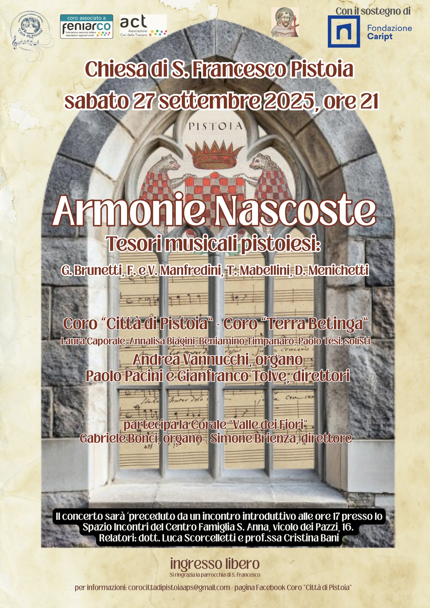 Sabato 27 settembre 2025, alle ore 21, presso la chiesa di San Francesco a Pistoia, concerto Armonie nascoste. Tesori musicali pistoiesi. Concerto di brani di autori pistoiese, preceduto da una conferenza di presentazione. Un repertorio che dal Seicento arriva fino al Novecento.