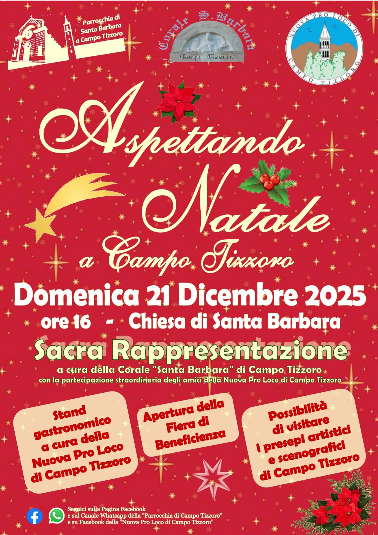Domenica 21 dicembre 2025, dalle ore 16, presso la Chiesa di Santa Barbara a Campo Tizzoro (San Marcello Piteglio), appuntamento con Aspettando Natale. Il pomeriggio prevede una sacra rappresentazione a cura della Corale Santa Barbara, con la partecipazione straordinaria degli Amici della Nuova Pro Loco di Campo Tizzoro.
