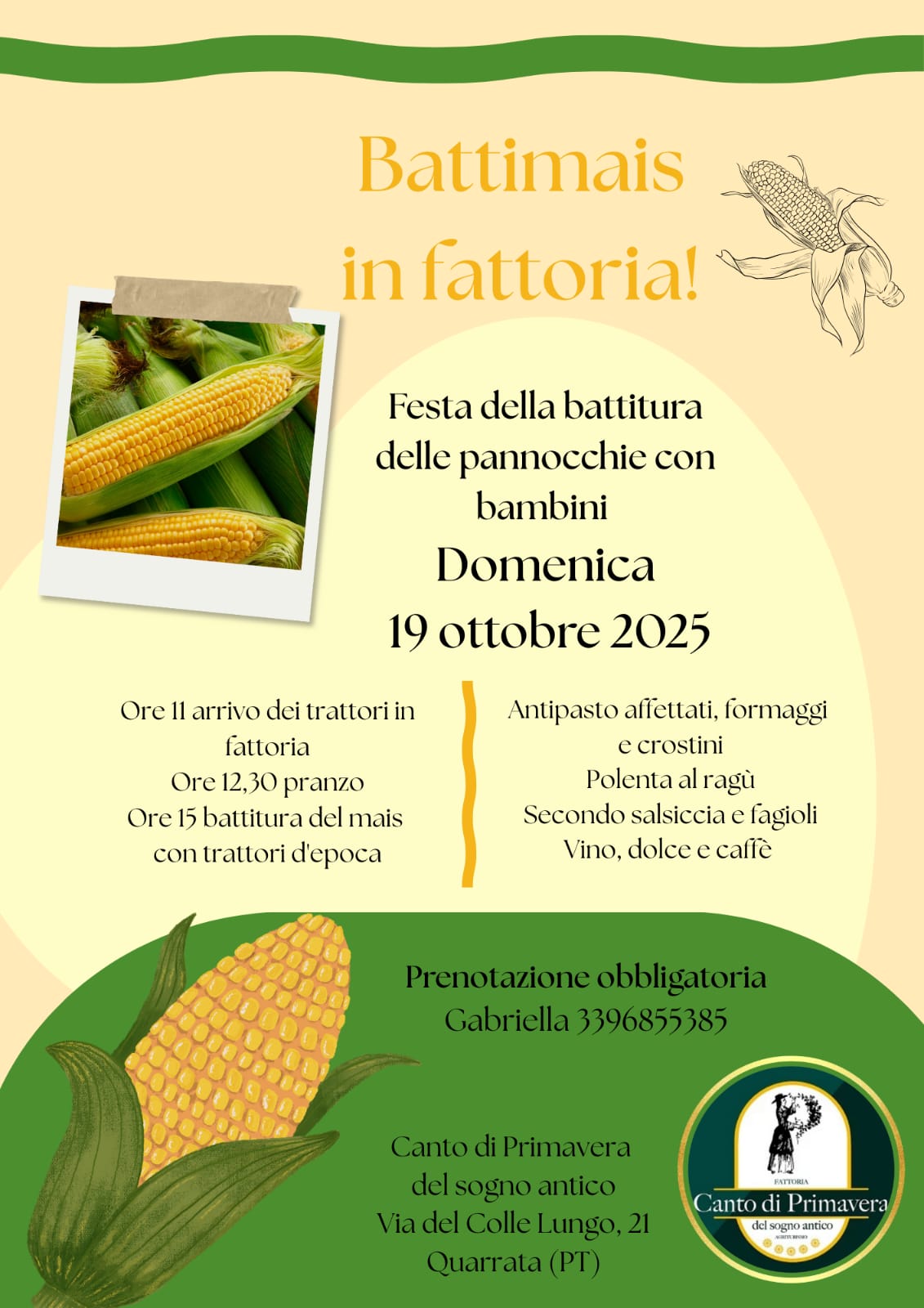 Domenica 19 ottobre 2025, la fattoria Canto di Primavera del Sogno Antico di Quarrata vi invita a Battimais in fattoria, una festa dedicata alla battitura delle pannocchie. In programma attività pensate per i più piccoli e momenti di gioco e scoperta a contatto con la natura.