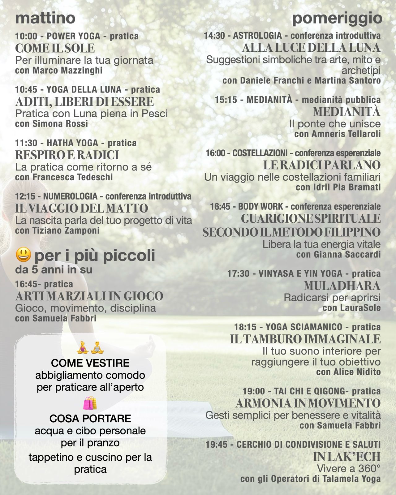 Il programma prevede pratiche di yoga al mattino e al pomeriggio, tra cui power yoga, yoga della luna, hatha yoga e yoga sciamanico, oltre a momenti di meditazione e altre attività. Non mancano spazi dedicati all’energia vitale con tai chi, qi gong e arti marziali per i più piccoli, a partire dai 5 anni.