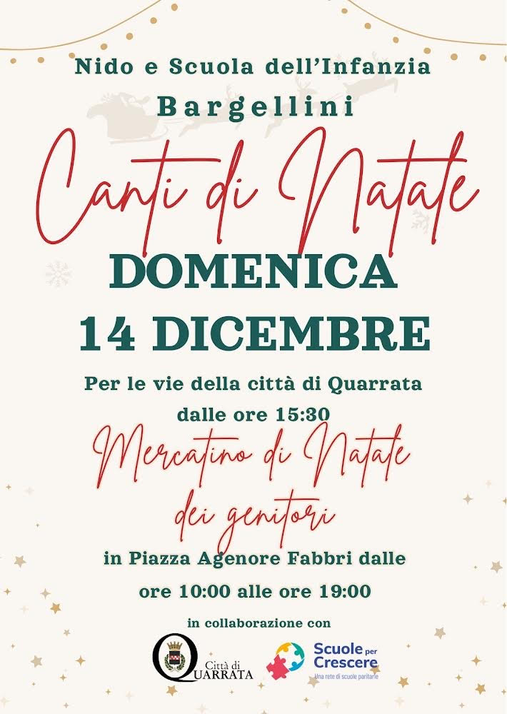 Domenica 14 dicembre 2025, alle ore 15.30, le vie del centro di Quarrata si animeranno con i canti di Natale eseguiti dai bambini del Nido e della Scuola dell’Infanzia Bargellini, per un pomeriggio all’insegna della musica e dell’atmosfera delle feste.