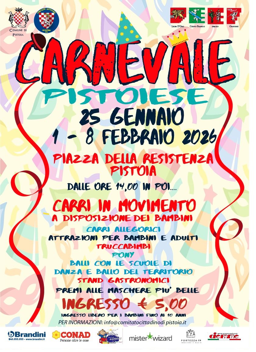 Torna il grande appuntamento con il Carnevale Pistoiese, una festa per grandi e piccini che trasforma Piazza della Resistenza (piazza d’Armi) in un coloratissimo corteo di musica, giochi e allegria.