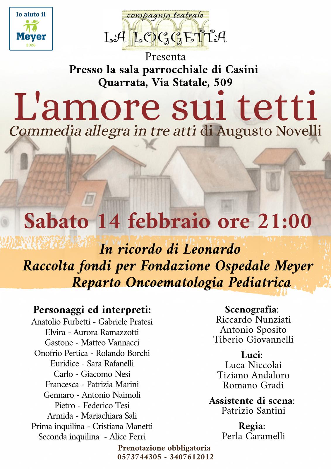 La Compagnia La Loggetta va in scena sabato 14 febbraio 2026 alle ore 21 con lo spettacolo L’amore sui tetti, presso la sala parrocchiale di Casini a Quarrata. Una commedia brillante in tre atti di Augusto Novelli, con la regia di Perla Caramelli.