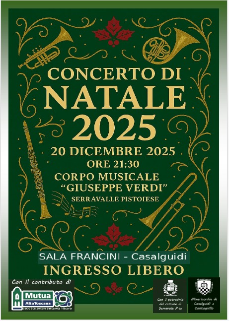 Si rinnova l’appuntamento con il Corpo Musicale Giuseppe Verdi di Serravalle Pistoiese per l’atteso Concerto di Natale, che quest’anno si terrà sabato 20 dicembre 2025, a partire dalle ore 21.30, presso il Teatro Francini di Casalguidi.