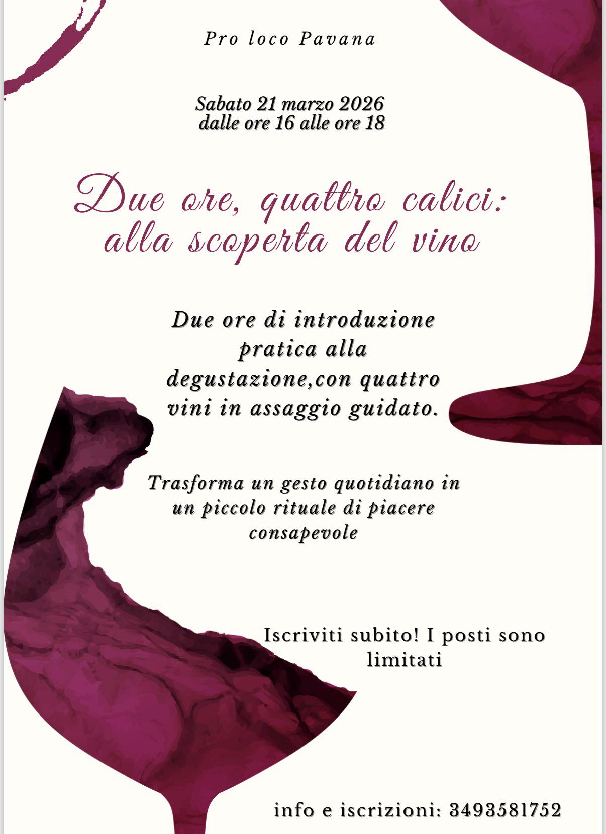 La Pro Loco di Pavana vi invita sulla Montagna Pistoiese a partecipare, sabato 21 marzo 2026 dalle ore 16 alle ore 18, all’iniziativa Due ore, quattro calici: alla scoperta del vino.