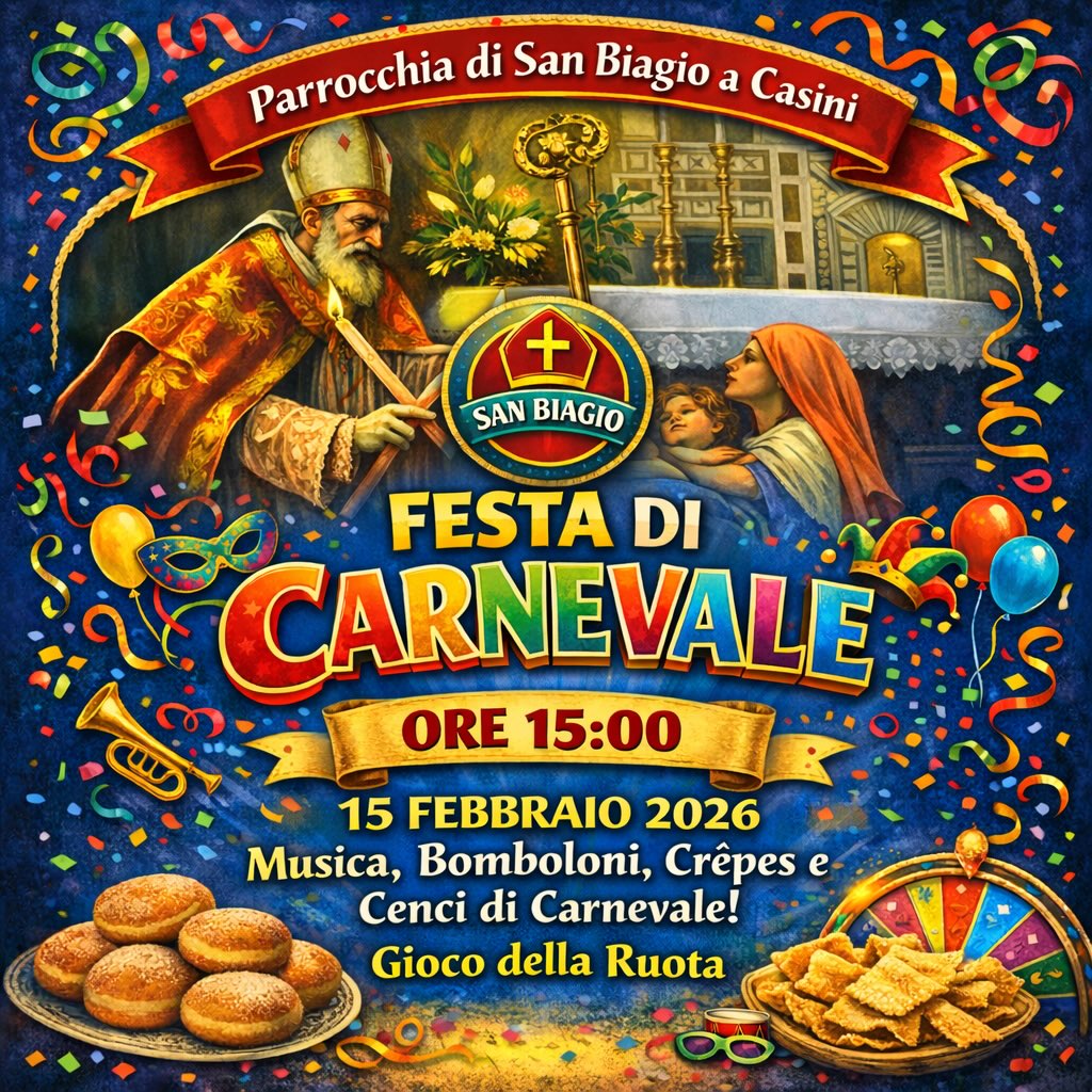 Domenica 15 febbraio 2026, a partire dalle ore 15, la parrocchia di San Biagio a Casini (Quarrata) invita grandi e piccoli a una vivace e coloratissima festa di Carnevale, tra musica, bomboloni, crêpes e cenci.