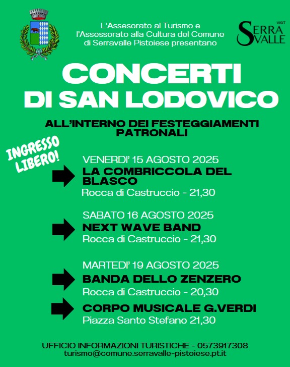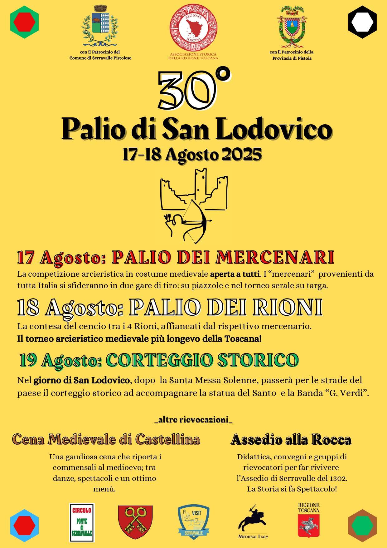Gli eventi, a ingresso gratuito, sono a cura di Assessorato al turismo del Comune di Serravalle Pistoiese, il Gruppo Arcieri Palio di San Lodovico e il Circolo del Ponte. Clicca qui per la locandina del Palio