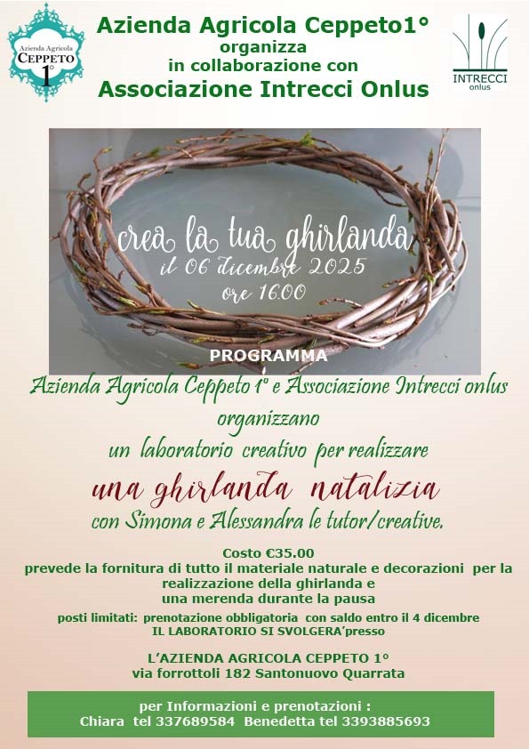 Sabato 6 dicembre 2025, alle ore 16, l’Agriturismo Ceppeto 1° ospiterà un laboratorio creativo dedicato alla realizzazione di ghirlande natalizie. Un pomeriggio speciale, pensato per immergersi nell’atmosfera delle feste e dare vita, con le proprie mani, a una decorazione unica da portare a casa.