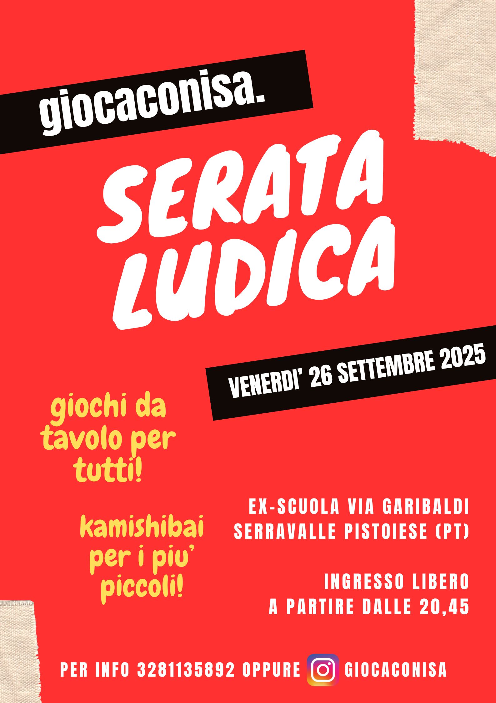 Venerdì 26 settembre 2025 l’associazione Giocaconisa vi aspetta a Serravalle Pistoiese, nei locali dell’ex scuola di via Garibaldi, per una serata all’insegna dei giochi da tavolo e del divertimento condiviso.
