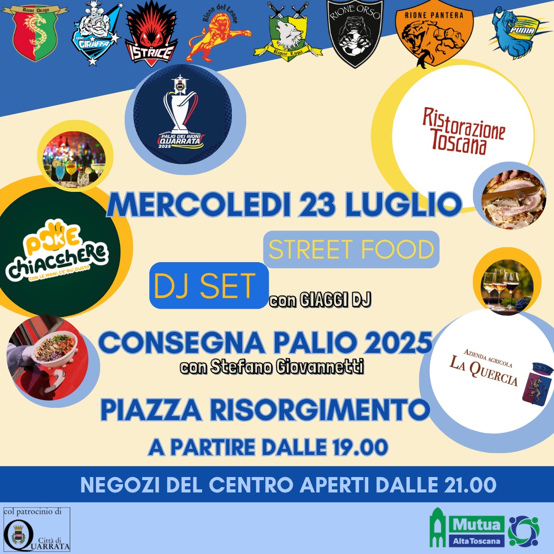 Mercoledì 23 luglio 2025, a partire dalle ore 19, in Piazza Risorgimento a Quarrata, gran finale del Palio dei Rioni di Quarrata.