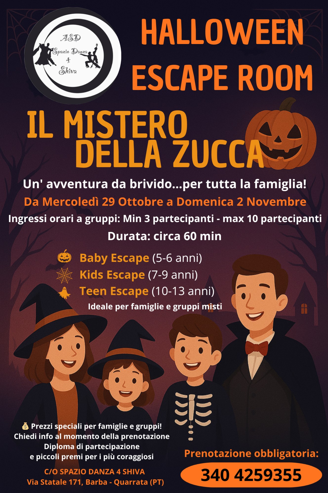 Presso ASD Spazio Danza 4 Shiva di Quarrata, da venerdì 29 ottobre a domenica 2 novembre 2025, vi aspetta un’avventura da brivido per tutta la famiglia con Halloween Escape Room – Il mistero della zucca. Un’esperienza a tema Halloween ricca di enigmi e rompicapi da risolvere.
