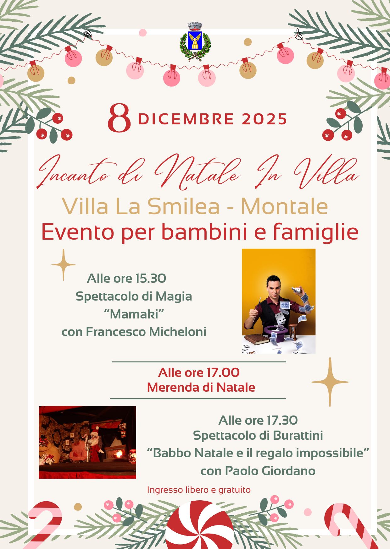 Lunedì 8 dicembre 2025, il Comune di Montale inaugura la magia delle festività natalizie con Incanto di Natale in Villa, un evento speciale dedicato ai bambini e alle famiglie nella splendida cornice di Villa La Smilea.