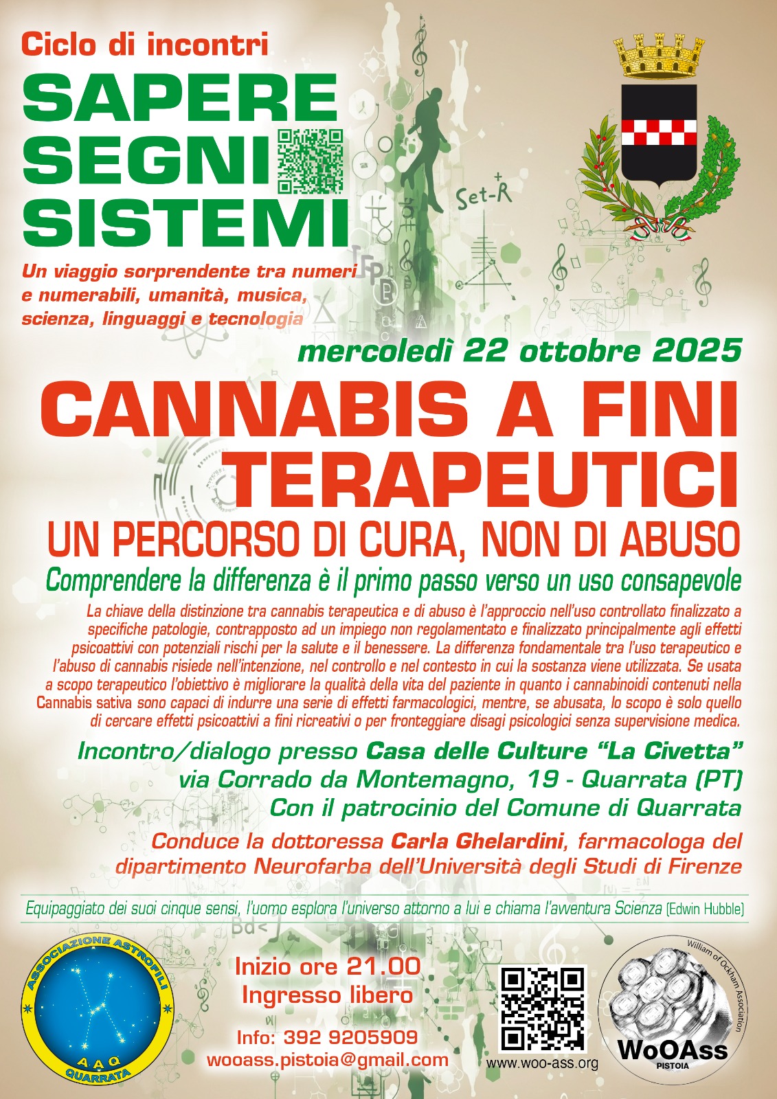 Da settembre a dicembre, ciclo di incontri presso La Civetta di Quarrata dal titolo Sapere, Segni, Sistemi. Un viaggio sorprendente tra numeri e numerabili, umanità, musica, scienza, linguaggi e tecnologia.