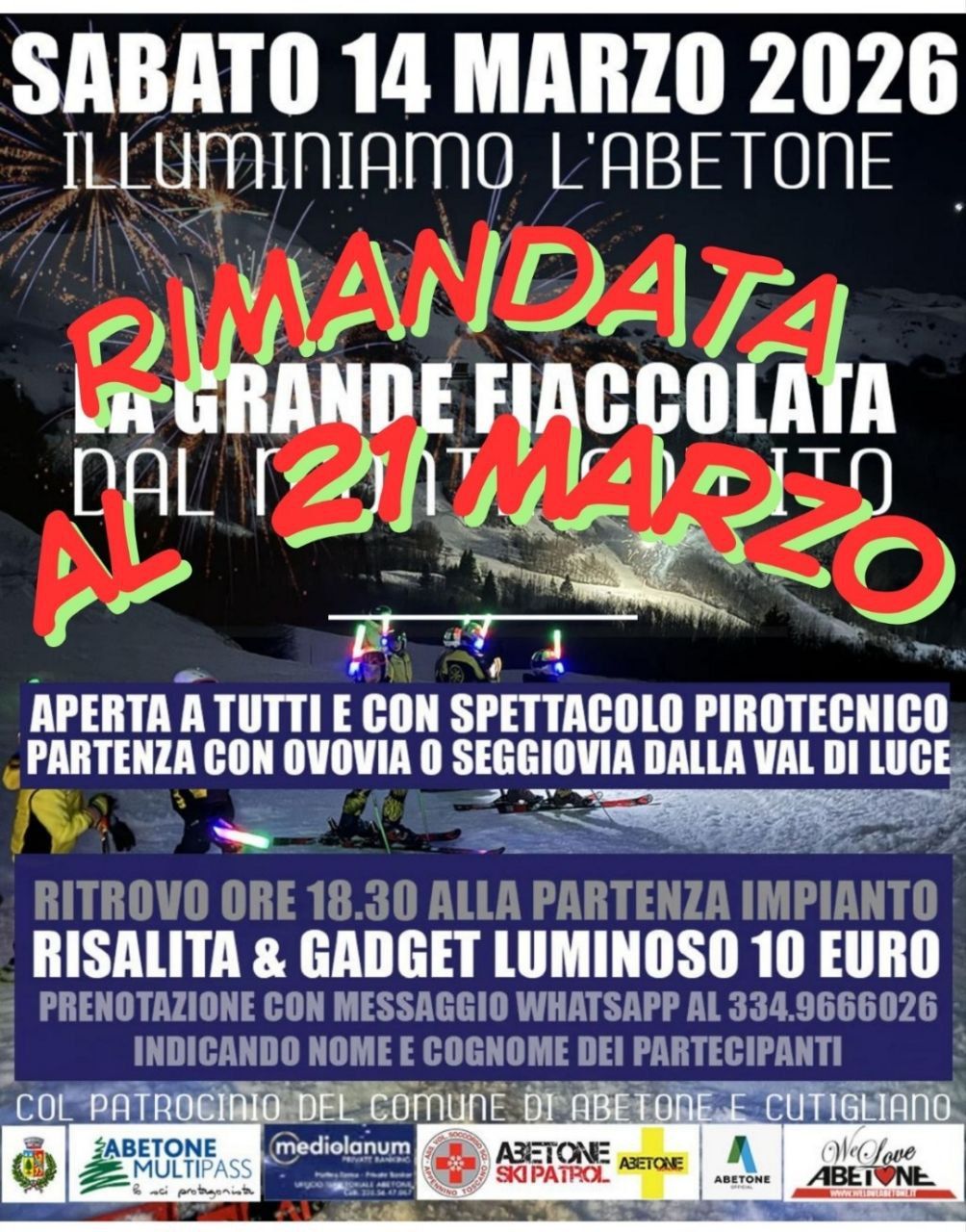 Sabato 21 marzo 2026 torna La grande fiaccolata dal Monte Gomito, il tradizionale appuntamento aperto a tutti che illumina l’Abetone con una suggestiva discesa notturna sugli sci e uno spettacolo pirotecnico finale.