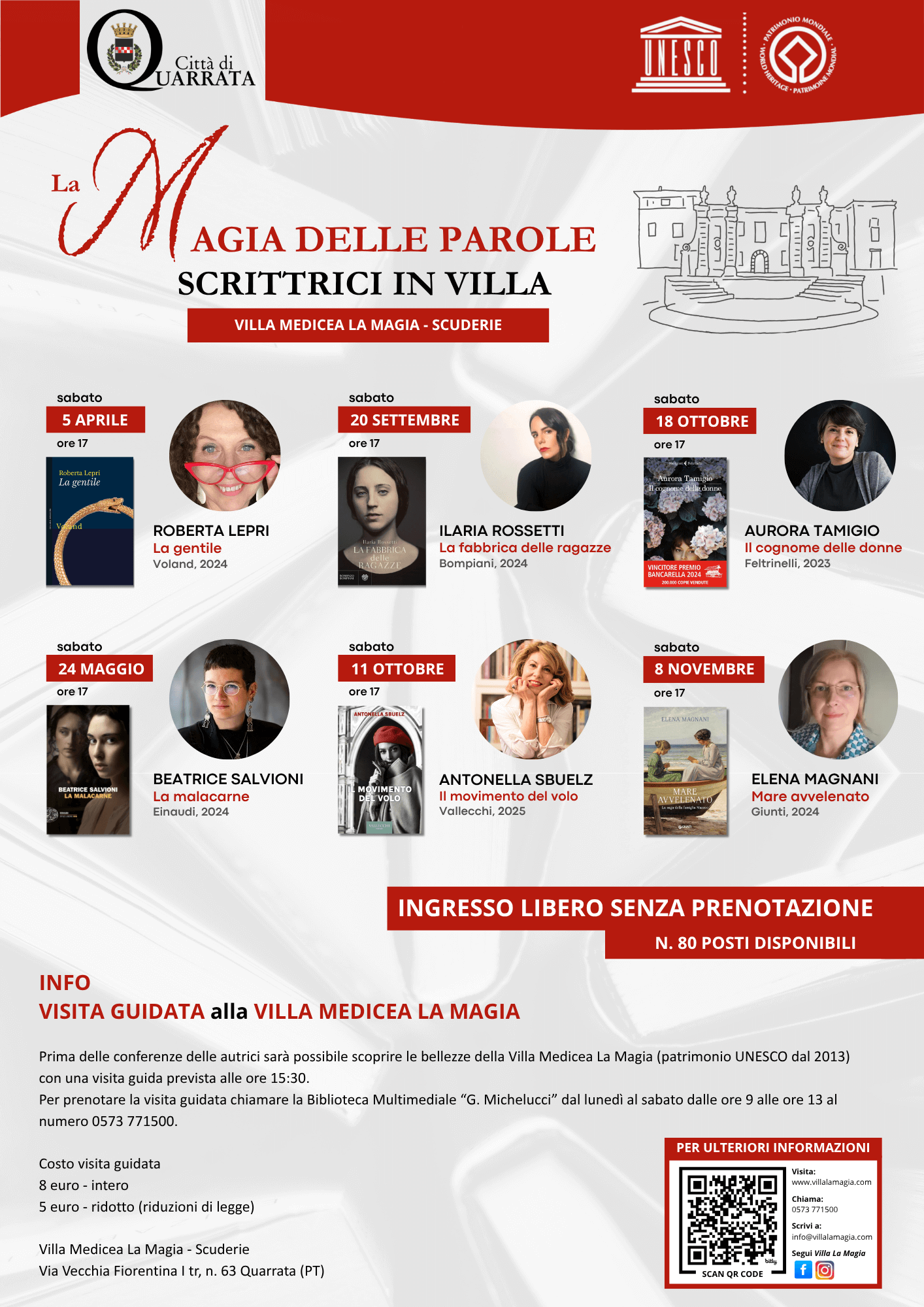 Prima delle conferenze, alle ore 15.30 sarà possibile visitare la Villa Medicea La Magia con una visita guidata al costo di euro € 8 (intero) o € 5 (riduzioni, insegnanti e studenti). Prenotandosi al numero +39 0573 771500 dal lunedì al sabato, orario 9-13.