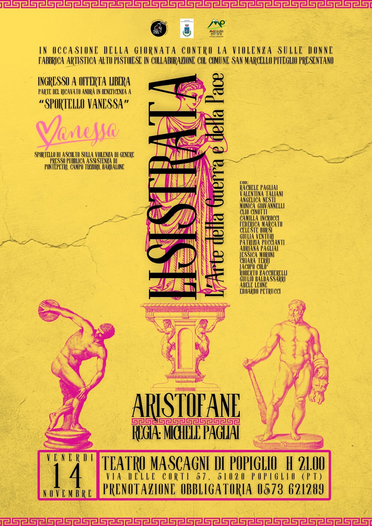 In occasione della Giornata Internazionale Contro la Violenza sulle Donne, al Teatro Mascagni di Popiglio andrà in scena Lisistrata, interpretata dagli allievi e dalle allieve del corso di teatro diretto dal regista e attore Michele Pagliai. L’appuntamento è per venerdì 14 novembre 2025 alle ore 21.