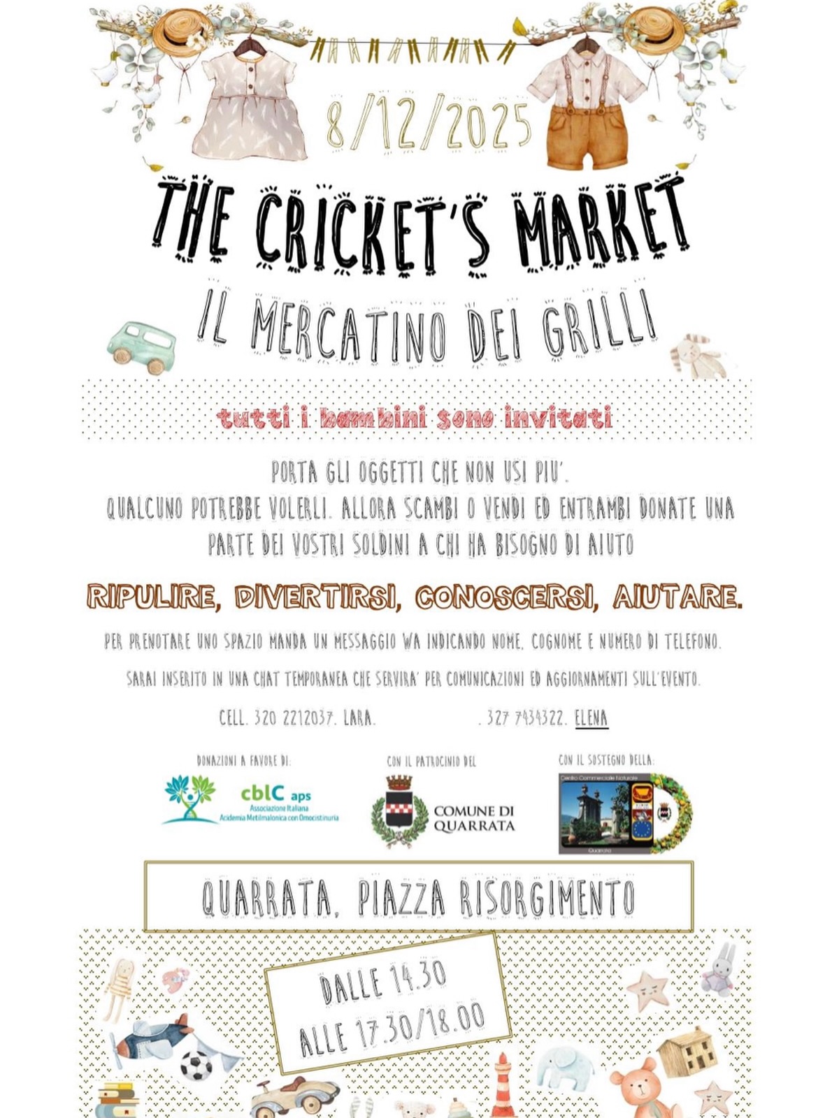 Mercatino dei bambini per la vendita e lo scambio dei oggetti usati. Il ricavato sarà devoluto a cblC aps – Associazione Italiana Acidemia Metilmalonica con Omocistinuria.