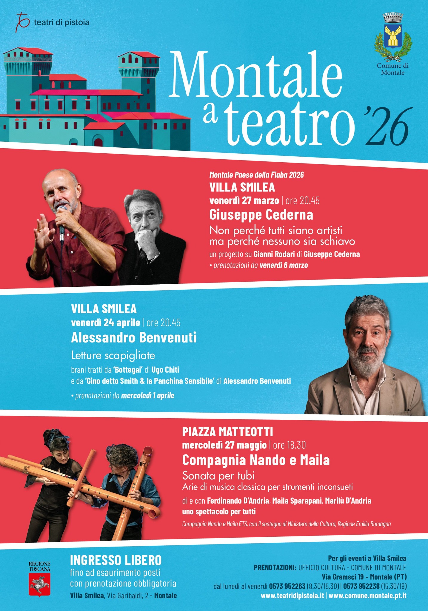 La rassegna aprirà il 27 marzo alle 20.45 a Villa Smilea con il progetto di Giuseppe Cederna Non perché tutti siano artisti, ma perché nessuno sia schiavo, dedicato alla figura e all’opera di Gianni Rodari (1920–1980). Il reading ripercorre il pensiero e l’eredità dello scrittore che ha rivoluzionato la letteratura per l’infanzia, unendo fantasia, innovazione linguistica e impegno civile. Cederna sarà inoltre protagonista di una mattinata per bambini e ragazzi il 28 marzo, sempre a Villa Smilea, nell’ambito di Montale Paese della Fiaba.