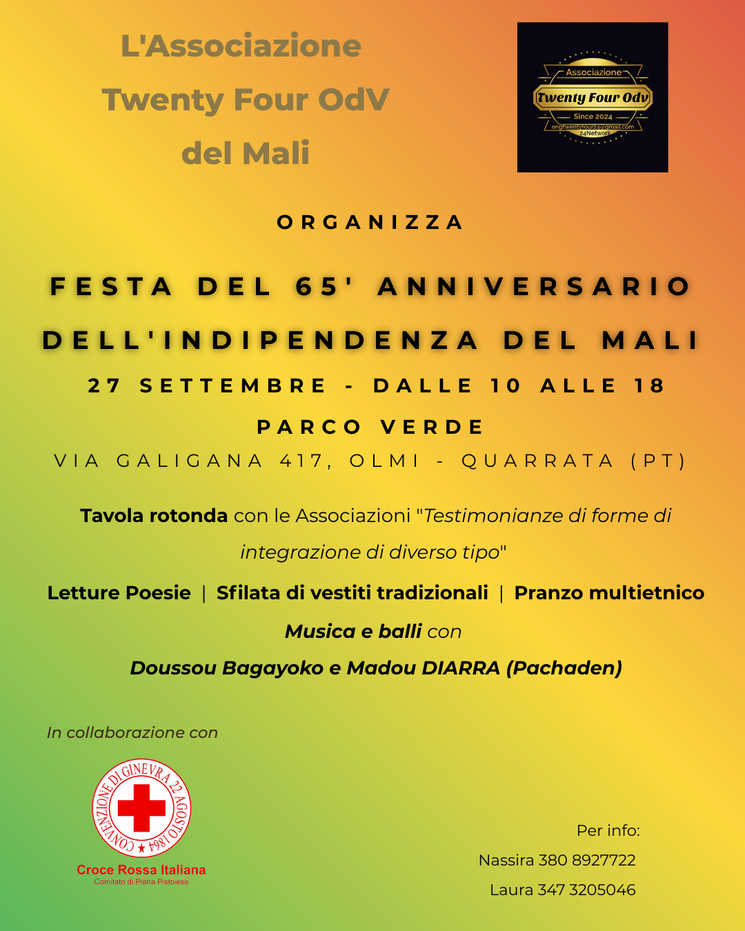 Sabato 27 settembre 2025, dalle ore 10 alle 18, presso il Parco Verdi Olmi di Quarrata, l’Associazione Twenty Four Odv organizza la Festa per il 65º anniversario dell’indipendenza del Mali, con un ricco programma di appuntamenti e iniziative.