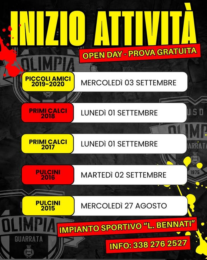 Dal 1 al 3 settembre 2025, alle ore 17, presso l’impianto sportivo Luca Bennati, prove gratuite con l’Open Day Football rivolto a tutti i bambini e le bambine non tesserati, dai 5 ai 10 anni (nati dal 2015 al 2020).