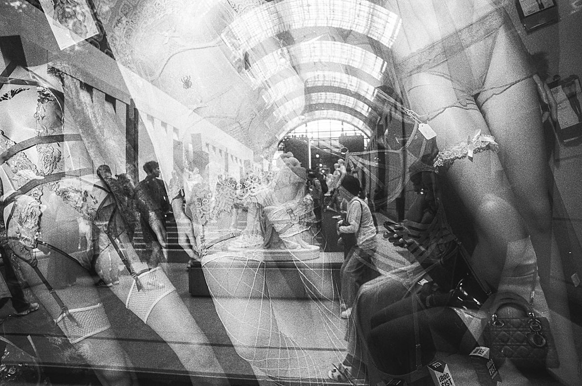 Le vetrine della biblioteca ospitano invece Les rendez-vous de Paris (2024), progetto realizzato in occasione del centenario del Movimento Surrealista. Attraverso l’uso del rullino 35 mm e della sovraimpressione di più immagini, Saielli costruisce composizioni oniriche in cui la fotografia diventa uno spazio di immaginazione, dove realtà e visione si fondono.