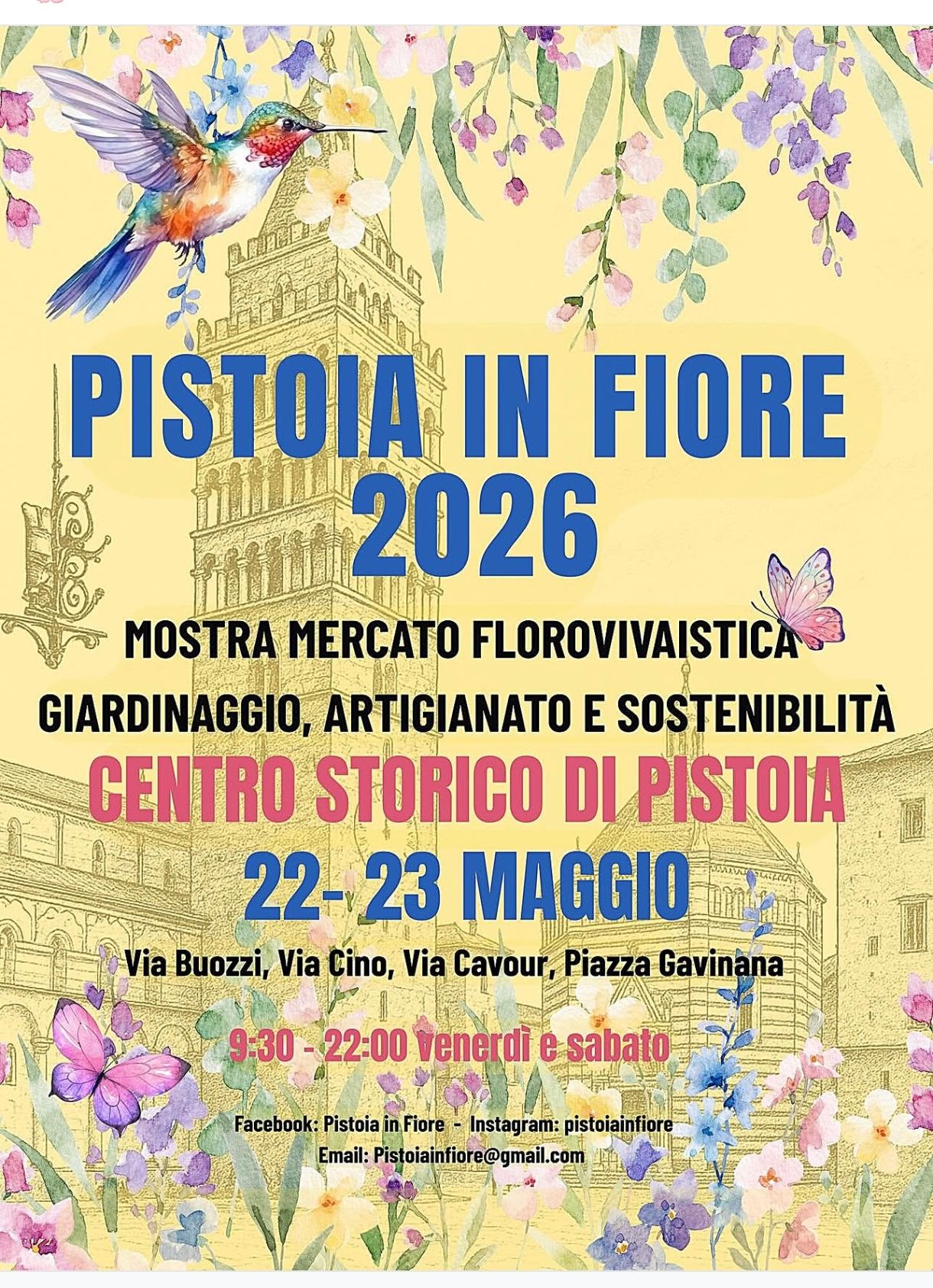 Venerdì 22 e sabato 23 maggio 2026 torna Pistoia in Fiore, la mostra mercato nel cuore della città dedicata al mondo del verde, del florovivaismo e dell’artigianato naturale.