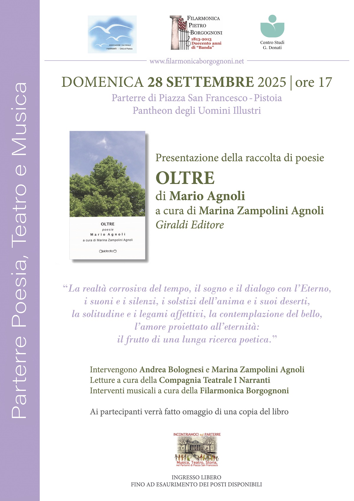 Presentazione del libro postumo di poesie Oltre di Mario Agnoli, a cura di Marina Zampolini Agnoli, domenica 28 settembre 2025 alle ore 17, presso il Pantheon degli Uomini Illustri di Pistoia.