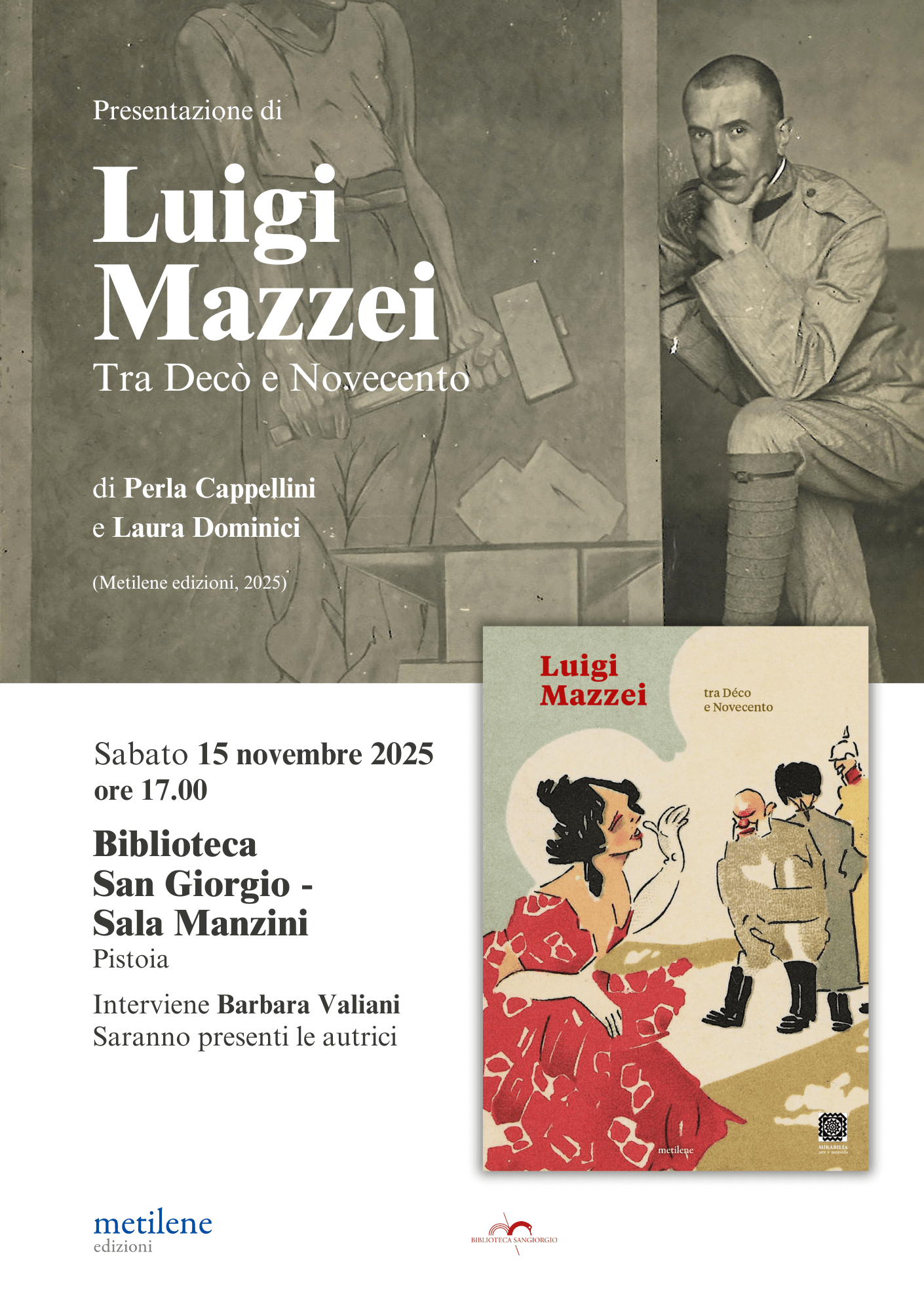 Sabato 15 novembre 2025, alle ore 17, presso la Sala Manzini della Biblioteca San Giorgio, Perla Cappellini e Laura Dominici presentano Luigi Mazzei. Tra Decó e Novecento (Metilene, 2025). Con un intervento di Barbara Valiani.