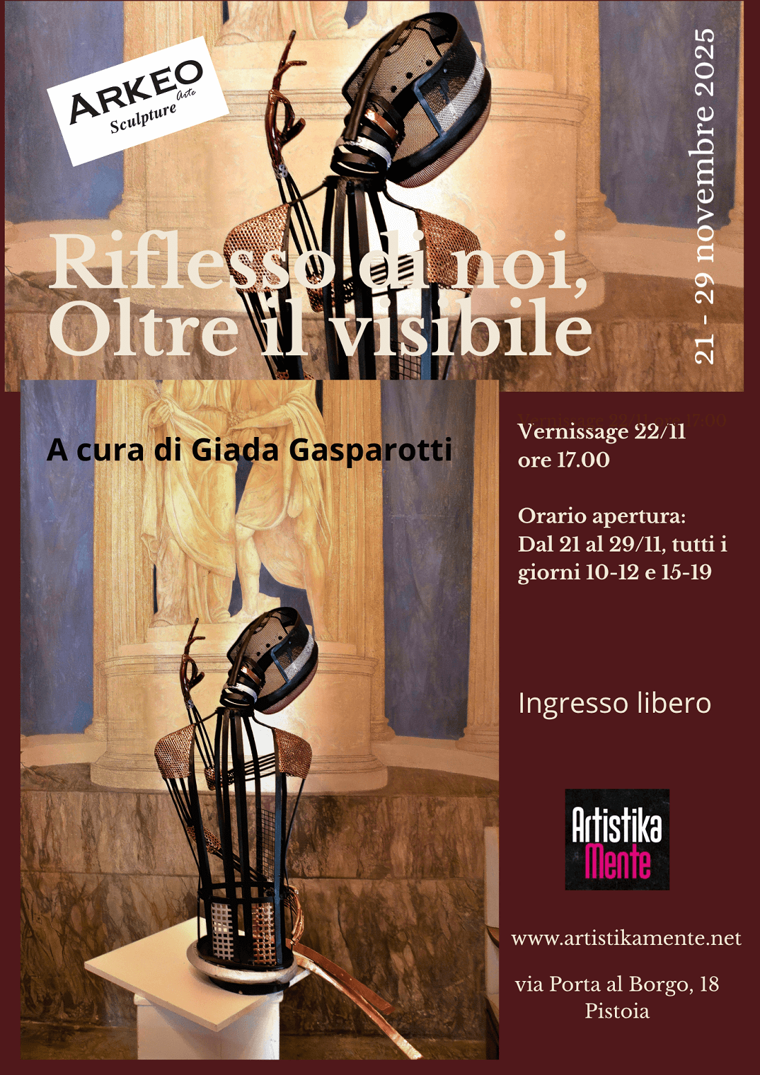 Presso i locali della Galleria ArtistikaMente di Pistoia, sabato 22 novembre 2025 alle ore 17 sarà inaugurata la mostra Riflesso di noi. Oltre il visibile dello scultore bolognese Arkeo Arte. A cura di Giada Gasparotti.