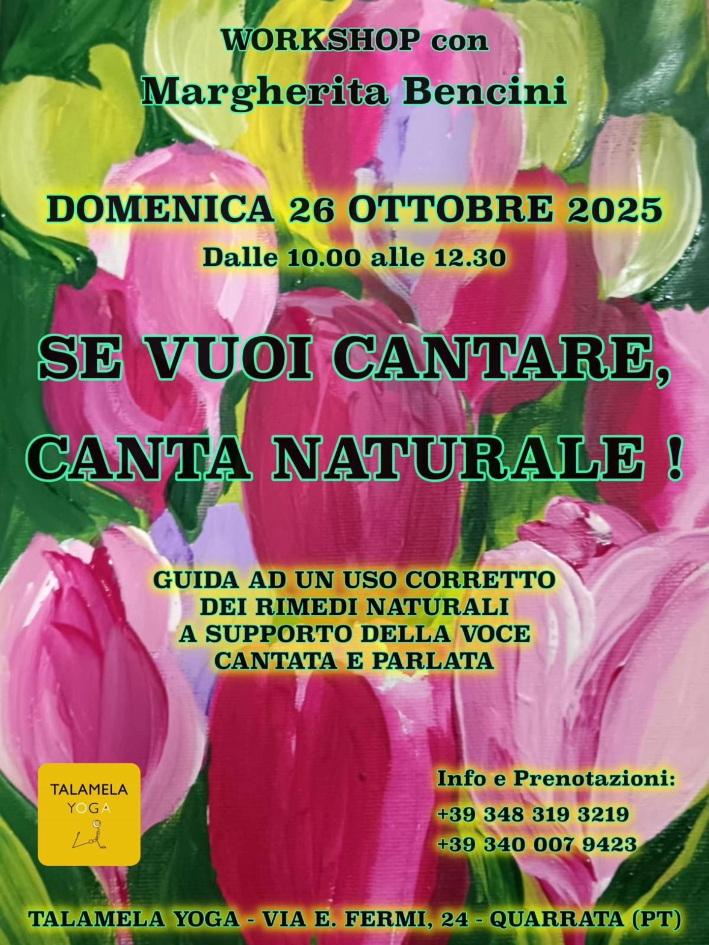 Domenica 26 ottobre 2025, dalle 10 alle 12.30, un incontro pratico e formativo con Margherita Bencini presso Talamela Yoga di Quarrata, per apprendere come utilizzare in modo corretto rimedi naturali a supporto della voce, sia cantata che parlata.