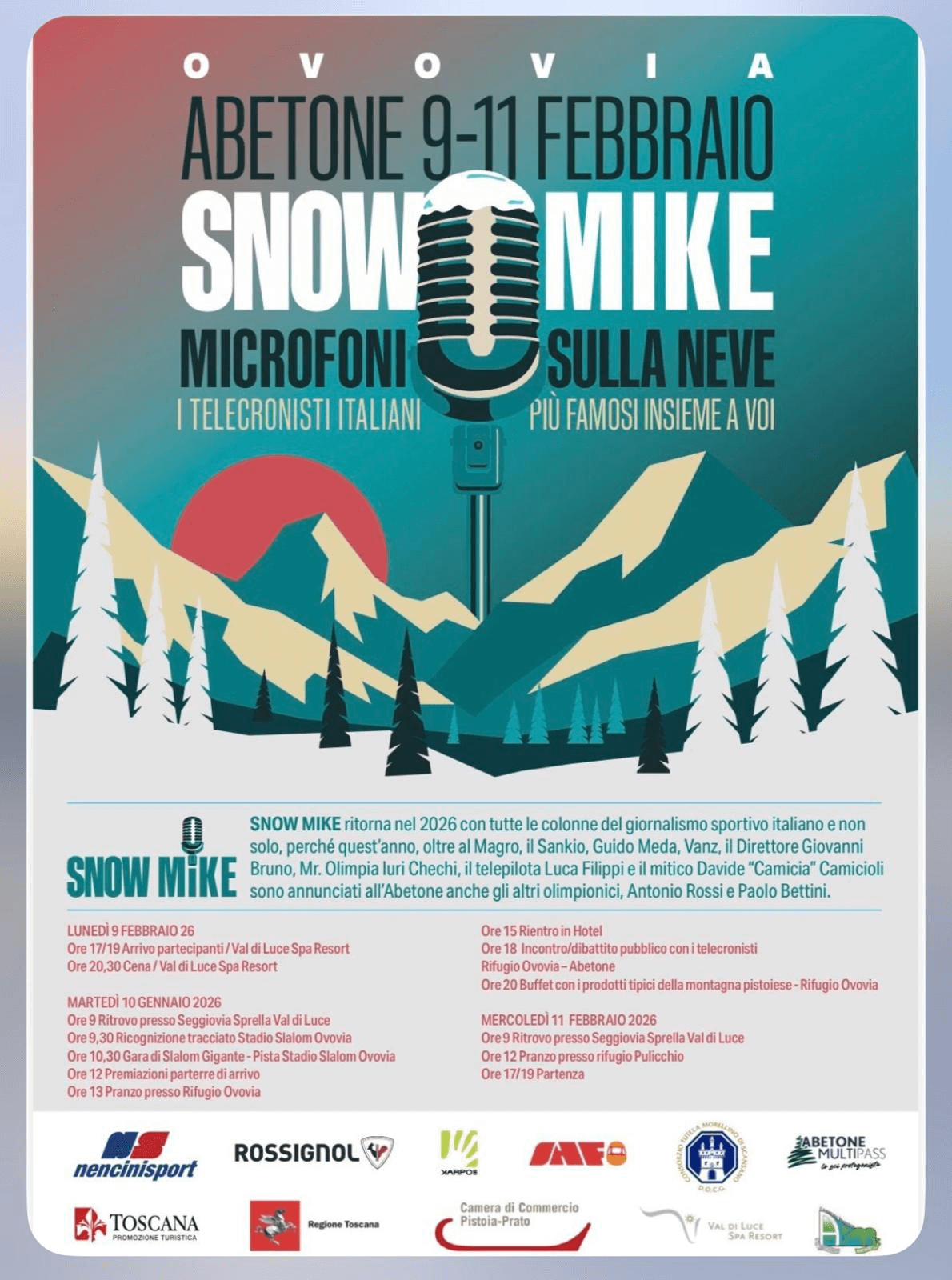 Da lunedì 9 a mercoledì 11 febbraio 2026 torna ad Abetone l’appuntamento con Snow Mike – Microfoni sulla neve, evento che riunisce alcune delle voci e dei volti più amati del giornalismo sportivo italiano insieme a grandi campioni olimpici.