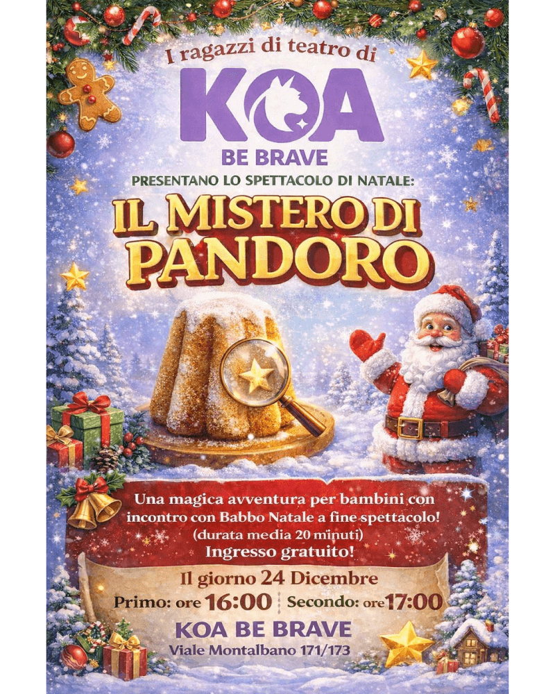 I ragazzi del teatro di Koa Be Brave vi invitano allo spettacolo di Natale Il mistero di Pandoro, una magica avventura per bambini che si conclude con l’incontro con Babbo Natale.