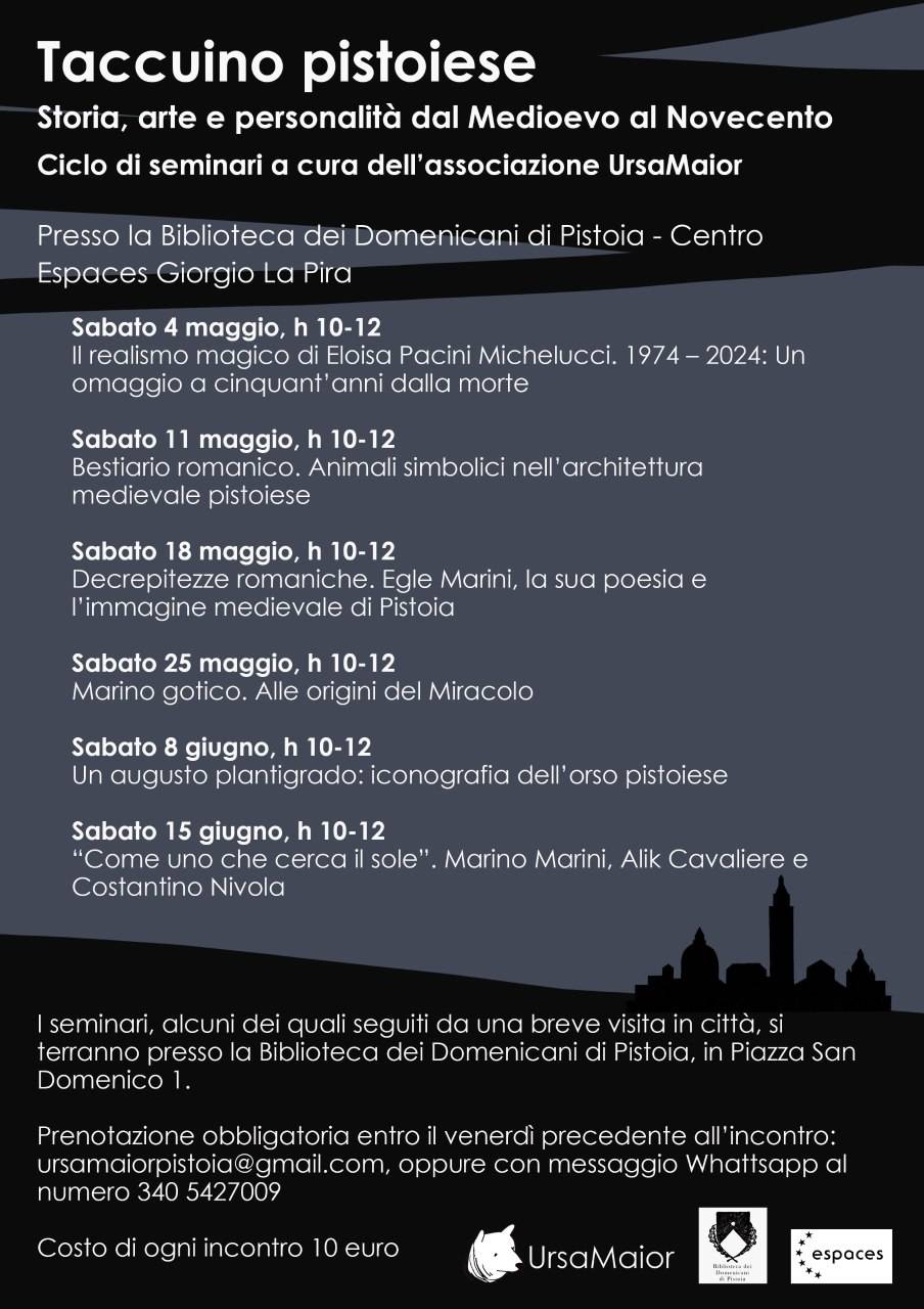 Da sabato 4 maggio a sabato 15 giugno 2024, presso la biblioteca dei Domenicani di Pistoia, appuntamenti con Taccuino pistoiese. Storia, arte e personalità dal Medioevo al Novecento, il ciclo di seminari a cura dell’Associazione UrsaMaior.